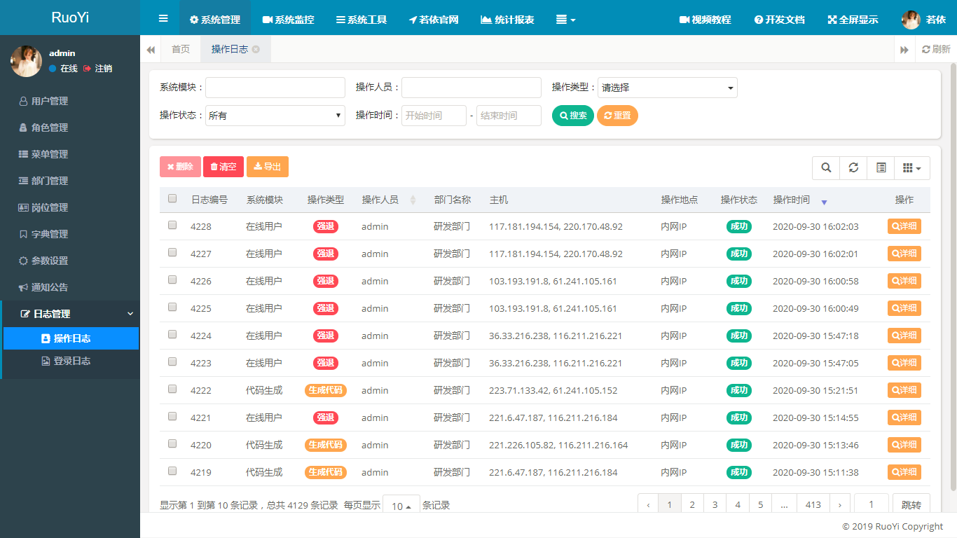 - 操作日志:系统正常操作日志记录和查询;系统异常信息日志记录和查询。
