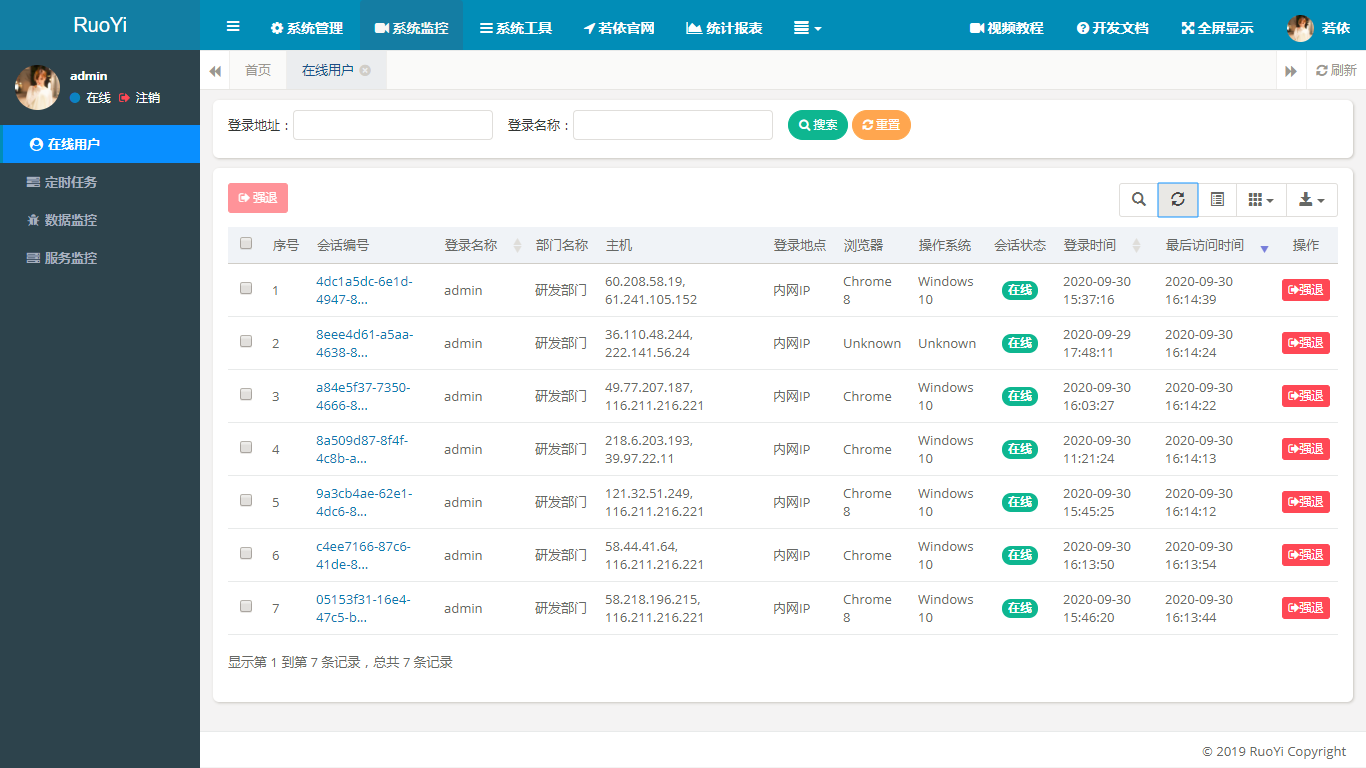 - 在线用户:当前系统中活跃用户状态监控。