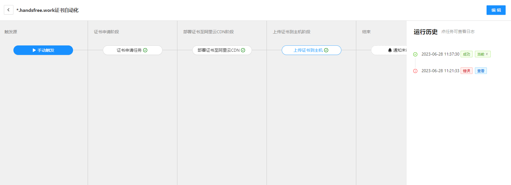 到这一步申请证书就已经配置完成了。 点击手动触发,就可以申请证书了。