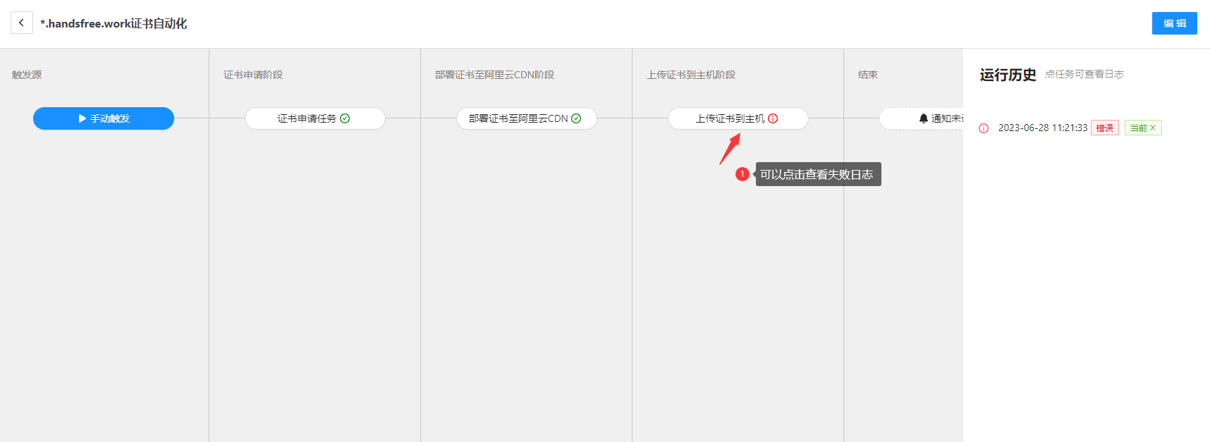 到这一步申请证书就已经配置完成了。 点击手动触发,就可以申请证书了。